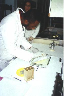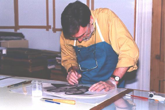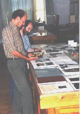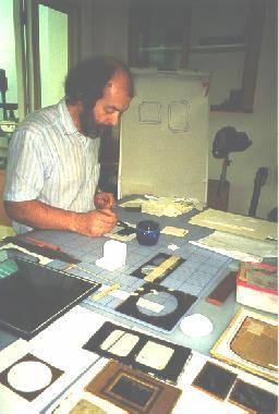 Manuel Serra from Barcelona, attending the four week advanced course MASTER CLASS in 1998, taking documentary photographs, as part of the conservation treatment record of a collodio-chloride self-toning P.O.P. print being treated by Montse Noguera his wife and partner. Manuel and Montse attended The Centre's seven week "Certificated" course in 1995. Participation in the 1998 course enabled them to revise and build upon the knowledge and skills they had acquired in the earlier course.