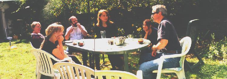 The courses at The Centre are intensive and all adhere to a programme. Each year the Moors strive to impart information more clearly, to improve teaching methods, and to share their expertise and skills by demonstration or example, thereby always seeking to raise the standard. Despite expecting course participants to work hard Ian and Angela endeavour to create a relaxed, friendly atmosphere. Class sizes are small which encourages participants to feel at ease and free to ask questions and take part in discussions. This alfresco scene shows, left to right, Helen Sharp, Angela Moor, Ian Moor, Nick Berkeley, Montse Noguera and Sarah Lewery taking a lunch break in The Centre's garden.
