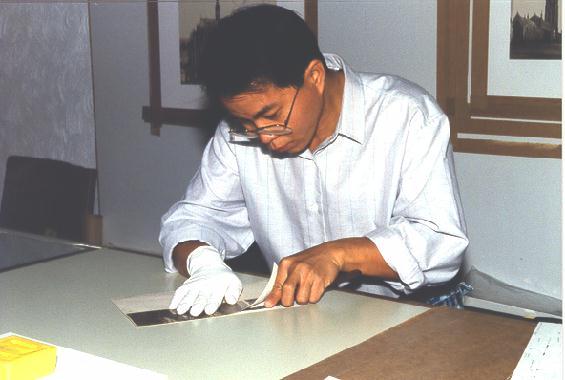 This photograph on the left shows Chan Yak Hock from Singapore dry splitting a mounted albumen print. Dry splitting historic, original mounts or dry splitting photographs from the face of original mounts is one technique taught as part of a comprehensive treatment strategy for mounted photographs. It is particularly useful for minimising treatment time, particularly where treatment procedures involves the use of controlled aqueous treatments and when preserving original mounts and therefore the historic integrity of the artefact.