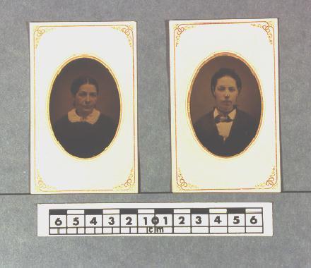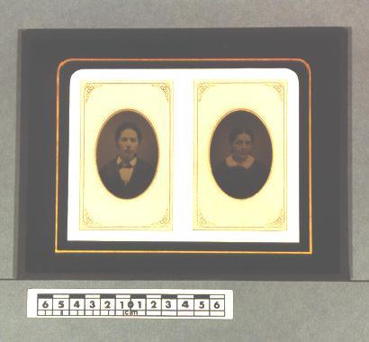 Image one above shows two loose, related (origin USA Mammoth Gallery Philadelphia), tintypes in their card mounts that were subsequently mounted and presented within a facsimile passe-partout. The passe-partout is glazed both sides and edge bound in order to reveal historical information on the verso of the tintype card mounts. This work was undertaken by Iwan Bryn Jones who attended The Centre's "Certificated" course in 1993. The Conservation documentation record for this project is retained within The Center's Conservation Treatment Archive.